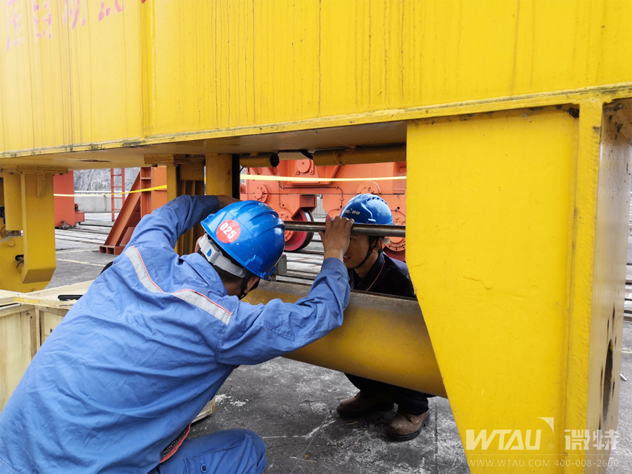 微特的技術(shù)工程師正在對向家壩電廠右岸進(jìn)水口3200KN門機液壓抓梁加裝水下穿銷傳感器