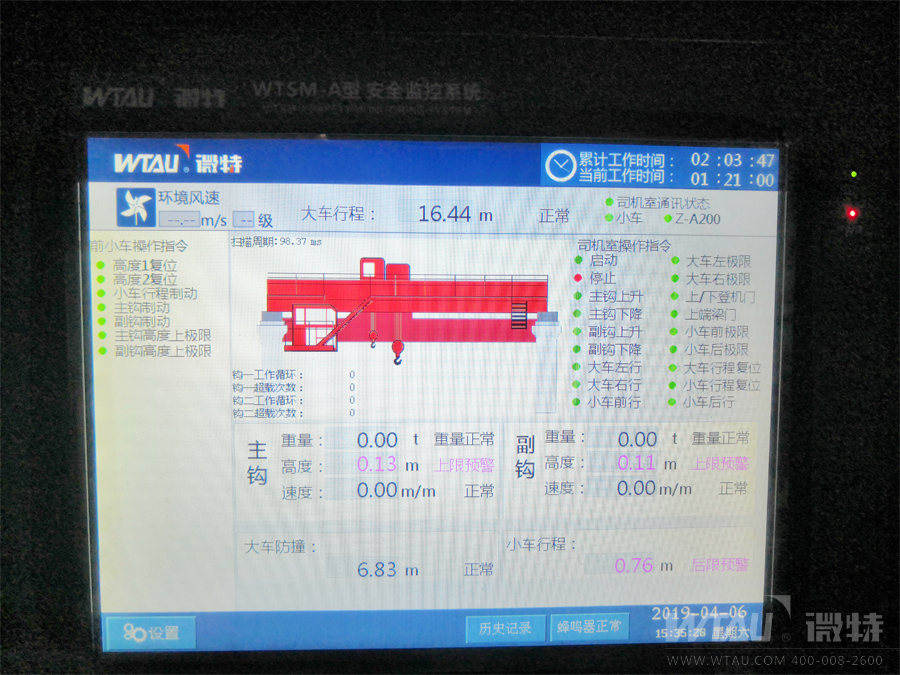 微特WTSM-A型起重機(jī)安全監(jiān)控系統(tǒng)具有實(shí)時監(jiān)控,動態(tài)顯示,聲光報警,數(shù)據(jù)存儲,斷電記憶以及密碼保護(hù)等功能,且儀表本身設(shè)計具有抗干擾性強(qiáng),操作界面方面,通用性強(qiáng)等優(yōu)點(diǎn)。經(jīng)過微特技術(shù)工程師的現(xiàn)場安裝調(diào)試完后順利通過了客戶及當(dāng)?shù)靥貦z機(jī)構(gòu)的驗(yàn)收,贏得了客戶的認(rèn)可,也為我們今后在淄博地區(qū)業(yè)務(wù)的深入開展起到了一個良好的開端。
