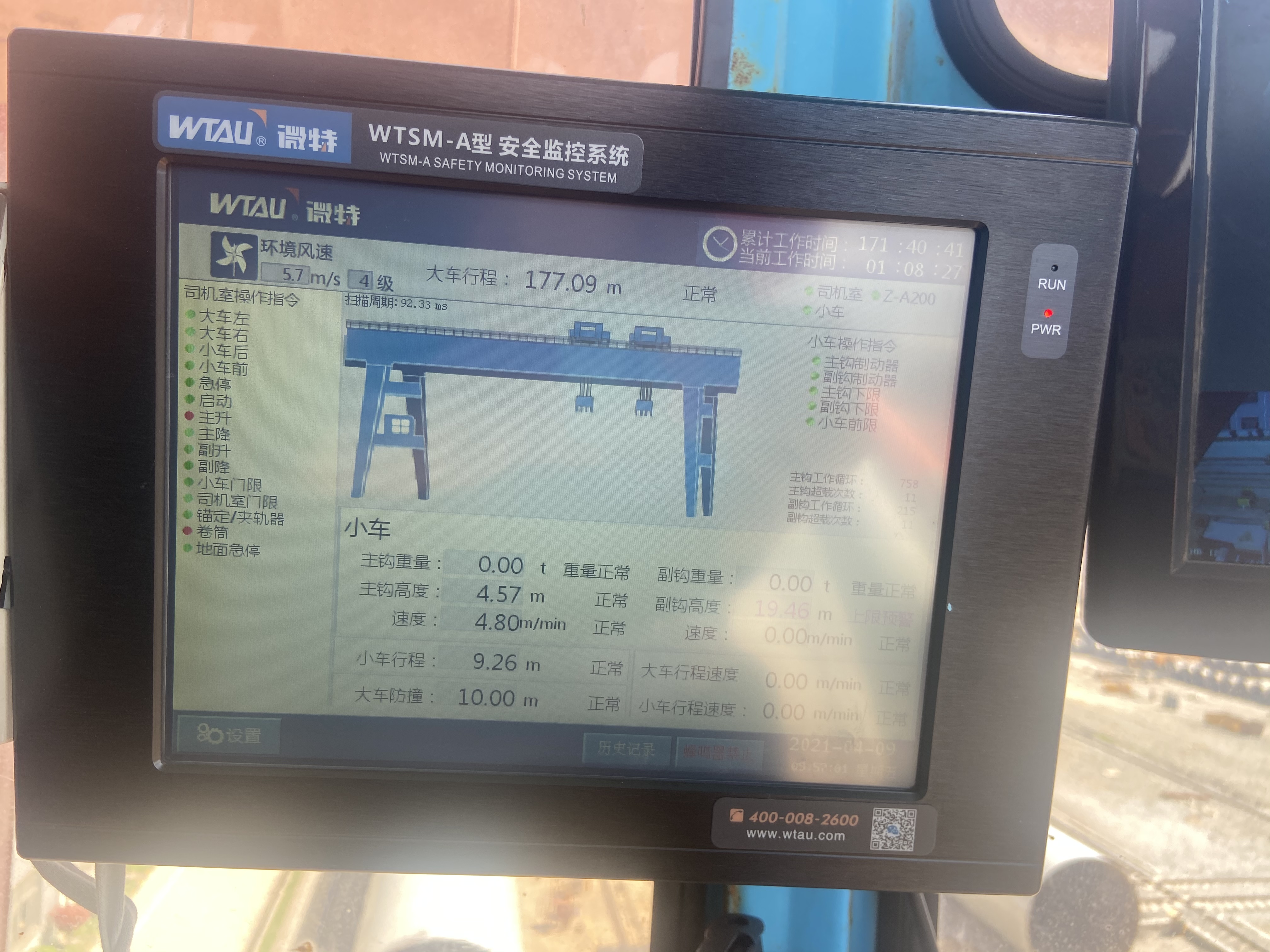 WTSM-A型龍門吊安全監(jiān)控管理系統(tǒng)采集了司機(jī)室下位機(jī),小車下位機(jī)及監(jiān)視門機(jī)各個(gè)動(dòng)作及運(yùn)行參數(shù),以及重量、小車行程各限位和操作指令狀態(tài)。各狀態(tài)指示燈在顯示紅燈時(shí)代表門機(jī)對(duì)應(yīng)機(jī)構(gòu)已動(dòng)作,綠燈代表對(duì)應(yīng)機(jī)構(gòu)無動(dòng)作,各重量行程及速度會(huì)在屏上顯示出對(duì)應(yīng)的數(shù)據(jù)。
