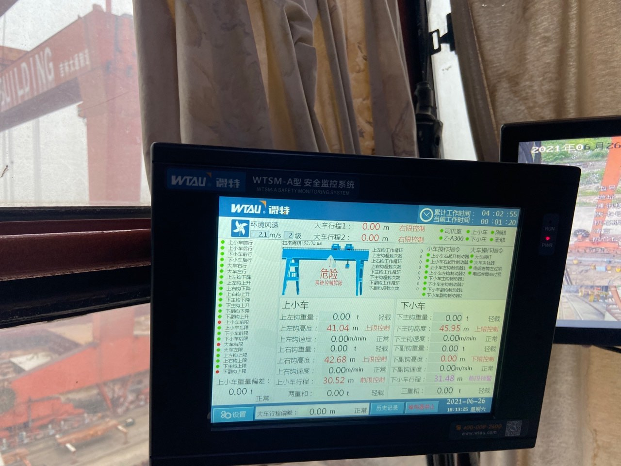 此次微特與泰州三福船舶公司合作項(xiàng)目為WTSM-A型龍門吊安全監(jiān)控管理系統(tǒng),采集了司機(jī)室下位機(jī),小車下位機(jī)及監(jiān)視門機(jī)各個(gè)動(dòng)作及運(yùn)行參數(shù),以及重量、小車行程各限位和操作指令狀態(tài)。各狀態(tài)指示燈在顯示紅燈時(shí)代表門機(jī)對(duì)應(yīng)機(jī)構(gòu)已動(dòng)作,綠燈代表對(duì)應(yīng)機(jī)構(gòu)無(wú)動(dòng)作,各重量行程及速度會(huì)在屏上顯示出對(duì)應(yīng)的數(shù)據(jù)。