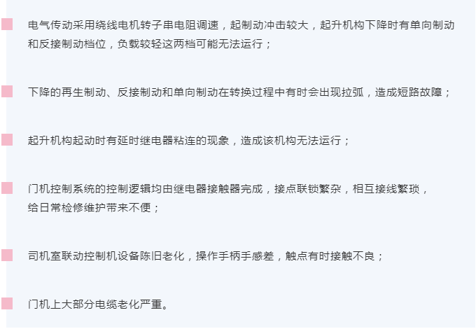 金銀臺樞紐1250T雙向門機電氣控制系統(tǒng)于2012年投運至今已有8年,控制系統(tǒng)元器件老化,部分元器件已停產,無法提供備件,控制線路老化,可靠性降低,影響設備安全運行,無法滿足設備安全生產的需要。原控制系統(tǒng)設計性能差,操作系統(tǒng)容易出故障,啟動沖擊較大,平穩(wěn)性差。據(jù)現(xiàn)場調研主要存在以下問題: