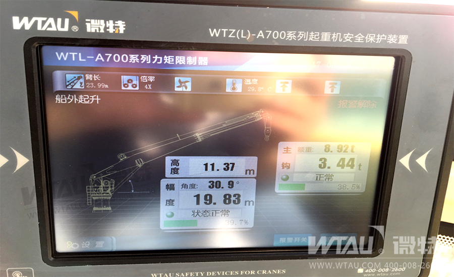 上圖為微特電子配備的WTL-A700型力矩限制器顯示儀,該型號儀表采用8寸TFT LCD觸摸屏,SG高耐蝕性熱鍍層鋼板機身,鋁合金面板;IP65防水性,最大800X600(V)像素;可動態(tài)仿真的顯示當前重量、幅度、角度、額重、工況等參數(shù)。并可外接PLC,智能儀表,板卡,模塊,變頻器等工業(yè)自動化設備。顯示儀自帶8M內(nèi)存,并可擴展外部記錄SD卡。