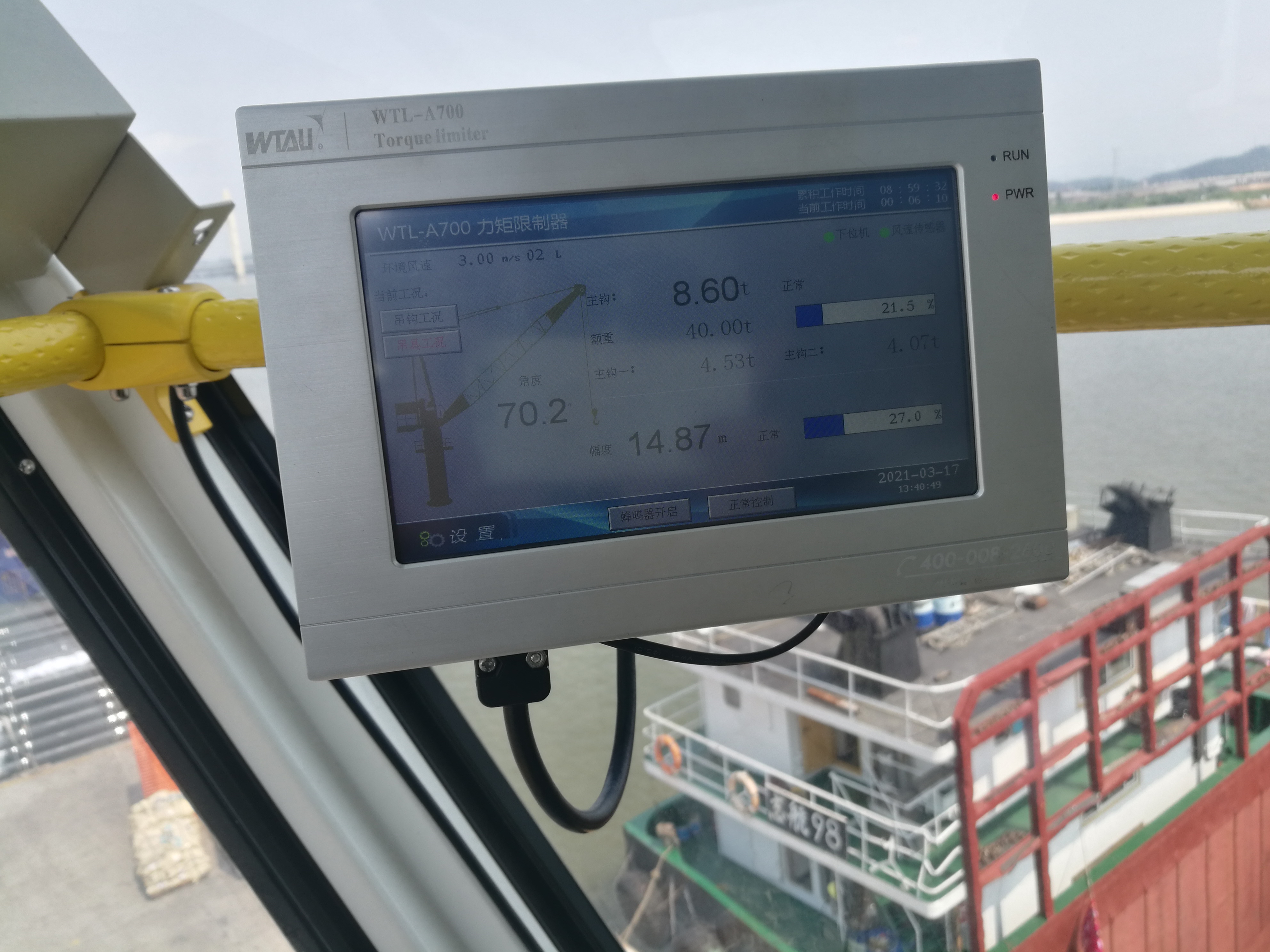 此次為廣東中藝固定式門座機(jī)配備的新WTL-A700力矩限制器就是微特主要針對(duì)固定式門座機(jī)研發(fā),生產(chǎn)的一款實(shí)用性非常強(qiáng)的儀表,采用觸摸屏屏顯示,用于四路以下重量信號(hào)和一路角度一路風(fēng)速信號(hào)的監(jiān)控。