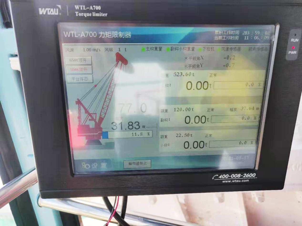 微特此次為亨通一航650T起重船配裝的是WTL-A700力矩限制器,實(shí)時(shí)顯示各個(gè)吊鉤的重量,當(dāng)前角度下的幅度范圍,海上風(fēng)速等級。滿足浮抬、頂升等多種工況下不同曲線要求;調(diào)試簡單,帶有數(shù)據(jù)存儲功能,能夠?qū)⒌鯔C(jī)歷史記錄狀態(tài)保存下載,隨時(shí)查看吊機(jī)歷史狀態(tài)。