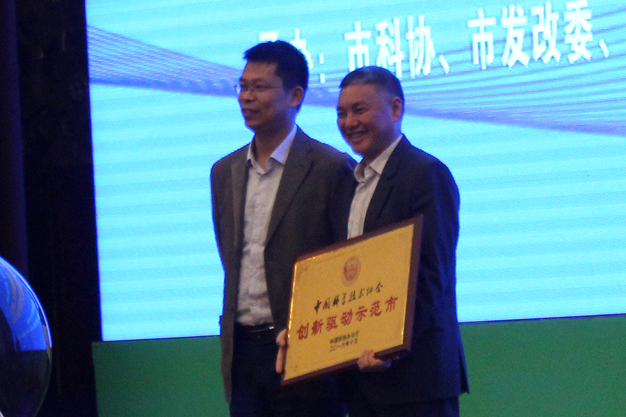 中國科協(xié)“創(chuàng)新驅動示范市”授牌儀式上,中國科協(xié)學會服務中心副主任徐強(左)授牌,副市長王應華(右)接牌。