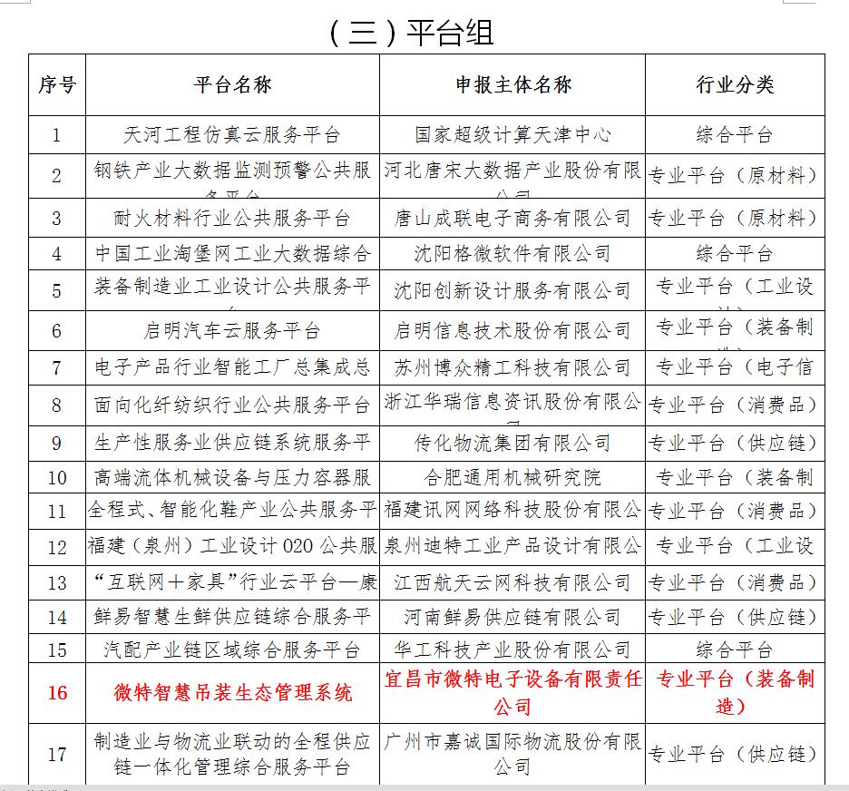 工信部官網(wǎng)公示入選的2017年服務(wù)型制造示范企業(yè)(項目、平臺)名單中,全國首批入選服務(wù)型制造示范企業(yè)有30家,示范項目60家,示范平臺30家。“微特智慧吊裝生態(tài)管理系統(tǒng)”成功入選服務(wù)型制造示范平臺。