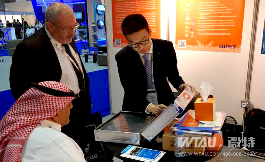 阿布扎比展會上,微特電子海外銷售經(jīng)理和來訪客戶進(jìn)行技術(shù)交流。