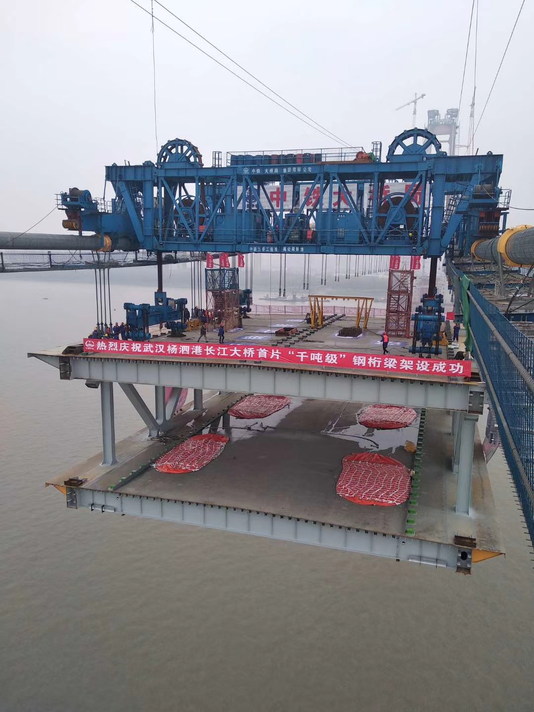 楊泗港長江大橋主跨首個千噸級鋼梁架設(shè)成功