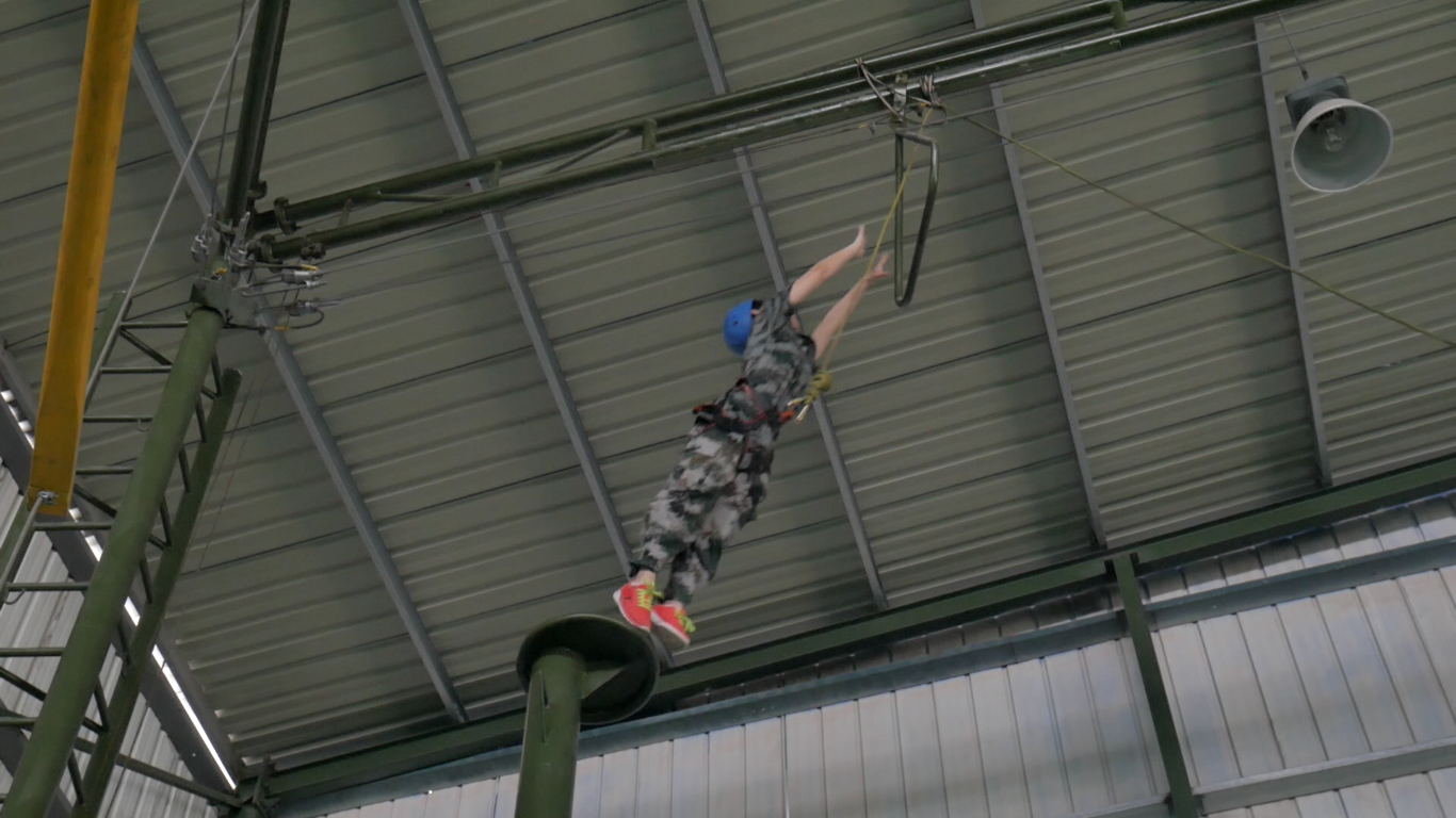 完成相關軍訓科目的操練后,全體迅速轉場,進入高空抓杠和一線生機項目。想要完成,個人和團隊必須都有所突破。