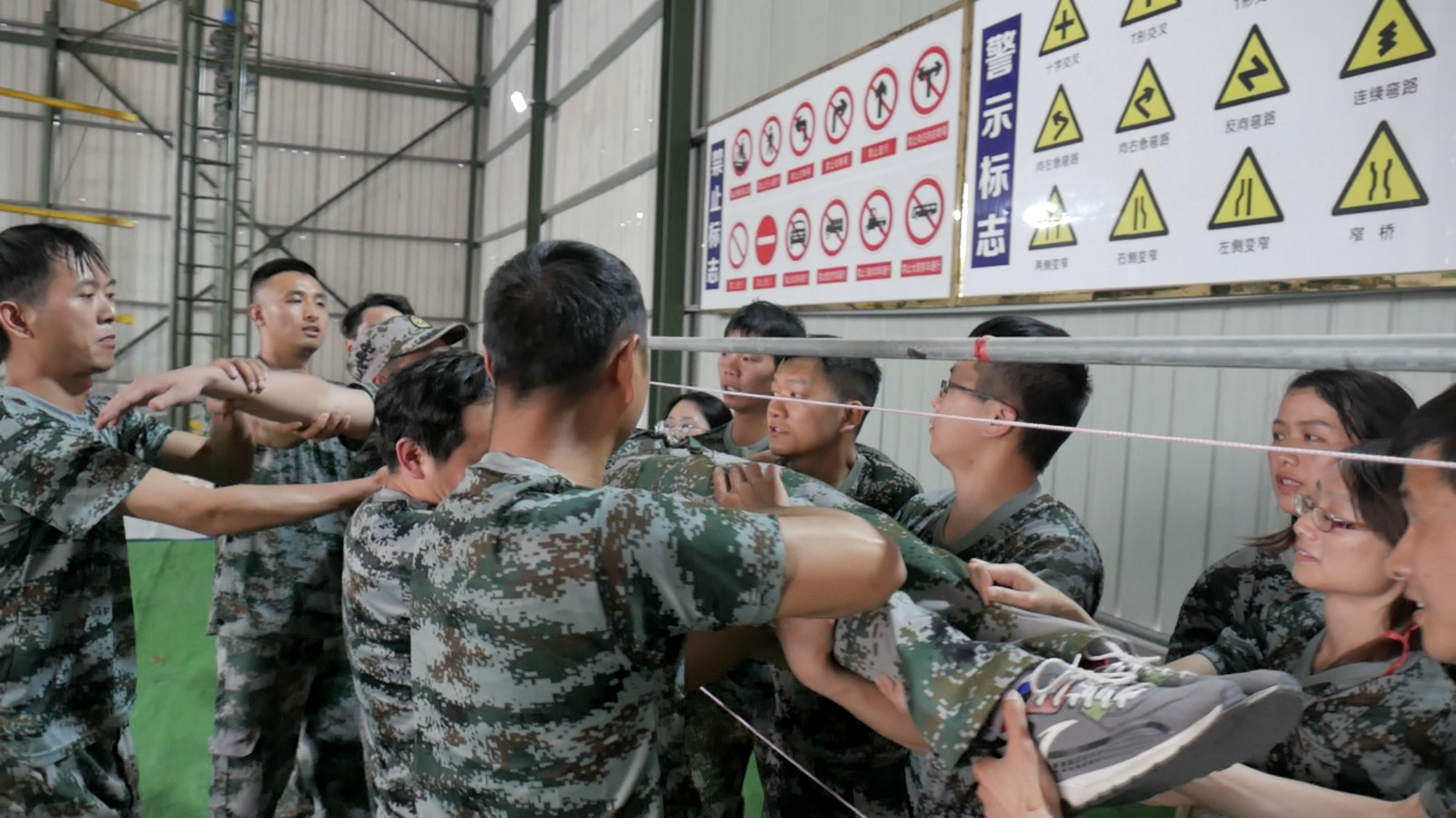 一線生機:高度1.7米的兩桿之間,有一個寬2米,高0.5米的區(qū)域為生存區(qū)域。隊員們在不借助任務工具的情況下合作全員通過該區(qū)域,任何觸碰到區(qū)域邊界繩的行為被視為違規(guī)。它考驗團隊在短時間內發(fā)散思維,合理安排分工,充分計劃并有效執(zhí)行。