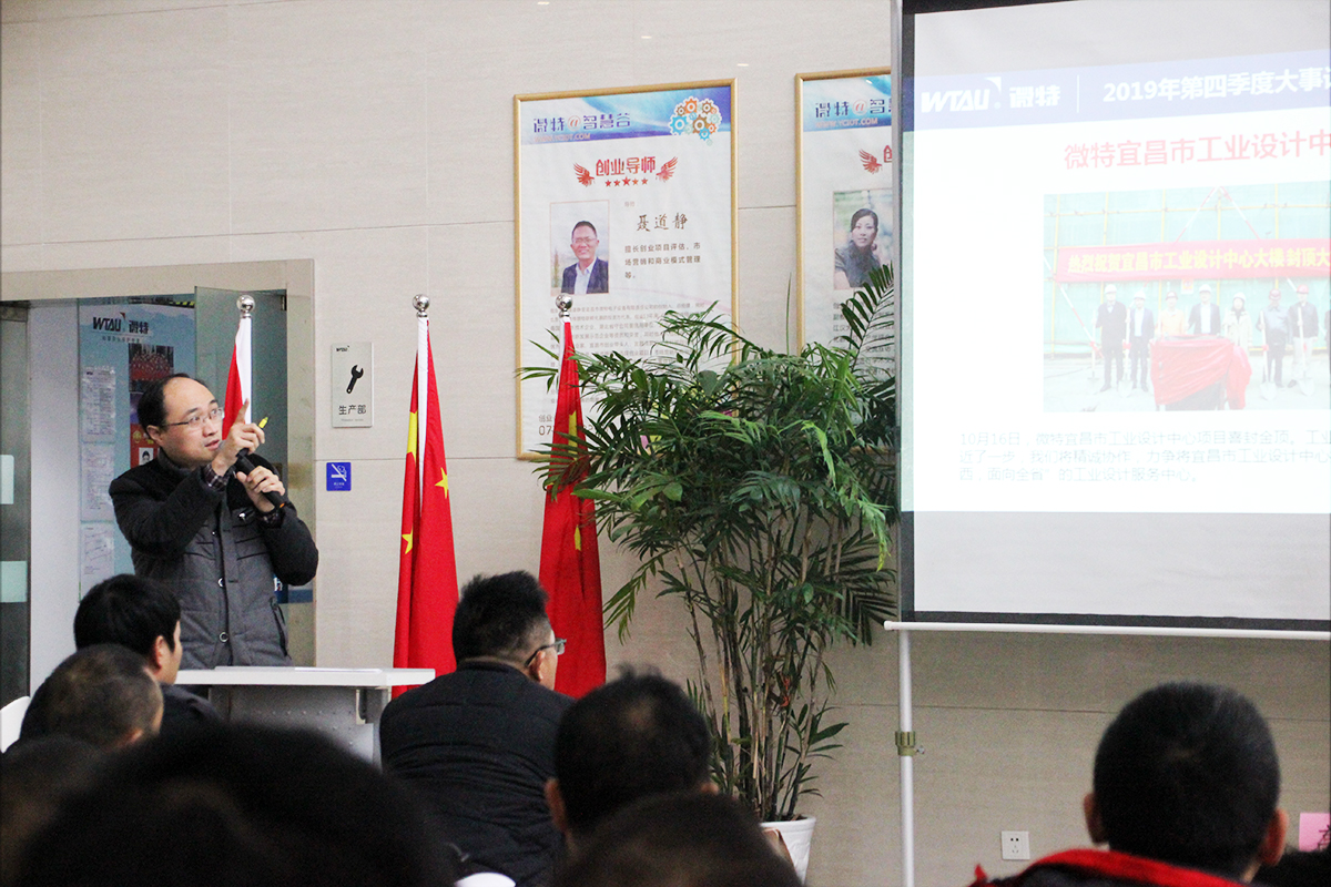 會(huì)議中,公司總經(jīng)理高鈺敏帶領(lǐng)與會(huì)同事一起回顧了19年第四季度的重要事件。在第四季度中,微特各部門全部順利完成19年全年累積銷售任務(wù),截止12月31日,公司整體大幅超額完成全年任務(wù);聶董參加湖北省委經(jīng)濟(jì)工作會(huì)議及省政協(xié)專題會(huì)并宣講發(fā)言;微特被國家工信部認(rèn)定為國家級(jí)工業(yè)設(shè)計(jì)企業(yè)并參加第三屆中國工業(yè)設(shè)計(jì)展覽會(huì);微特宜昌市工業(yè)設(shè)計(jì)中心項(xiàng)目喜封金頂;10月份,微特參加19年印尼海事展;聶董獲聘為三峽大學(xué)碩士生導(dǎo)師;微特受邀參加中電建協(xié)施工機(jī)械專業(yè)委員會(huì)年會(huì),參加中國機(jī)械工程學(xué)會(huì)物流工程分會(huì)六屆二次理事會(huì),參加印度國際工程機(jī)械與技術(shù)展覽會(huì)等多項(xiàng)重要會(huì)議。