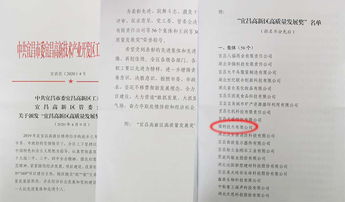 近日,微特技術(shù)有限公司榮獲由宜昌高新區(qū)黨工委、管委會授予的2019年度宜昌高新區(qū)“高質(zhì)量發(fā)展獎”。