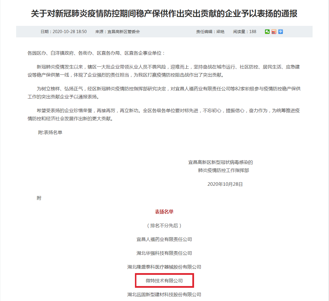 近期,宜昌高新區(qū)新型冠狀病毒感染的肺炎疫情防控工作指揮部發(fā)布了《關(guān)于對新冠肺炎疫情防控期間穩(wěn)產(chǎn)保供作出突出貢獻(xiàn)的企業(yè)予以表揚(yáng)的通報(bào)》,微特技術(shù)有限公司位列表揚(yáng)名單。