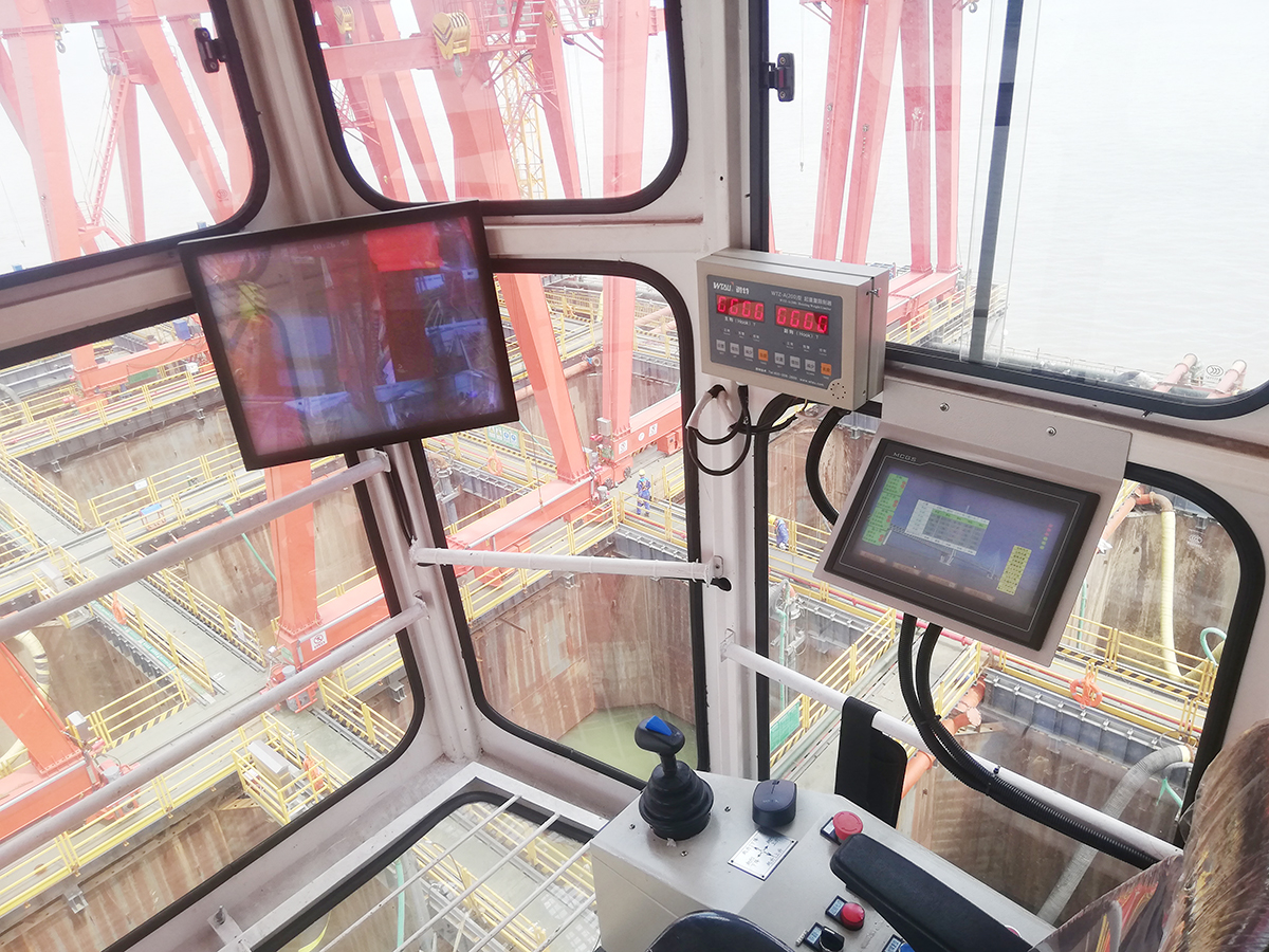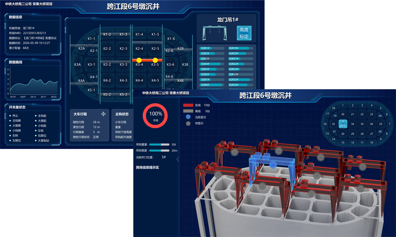 微特今年下半年與項(xiàng)目部多次溝通,與總工反復(fù)進(jìn)行技術(shù)協(xié)商及推演,最終決定使用龍門吊來(lái)監(jiān)測(cè)泥面高度,通過(guò)三維定位龍門吊的方案,找到每個(gè)龍門吊在沉井上的坐標(biāo),再結(jié)合卷?yè)P(yáng)機(jī)的高度變化,來(lái)實(shí)現(xiàn)每日單天每個(gè)井孔的最大深度測(cè)量,達(dá)到自動(dòng)測(cè)量自動(dòng)生產(chǎn)數(shù)據(jù)報(bào)表功能,使得沉井下沉高度自動(dòng)可視可測(cè)。
