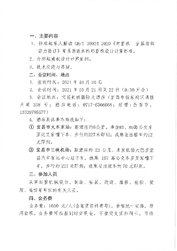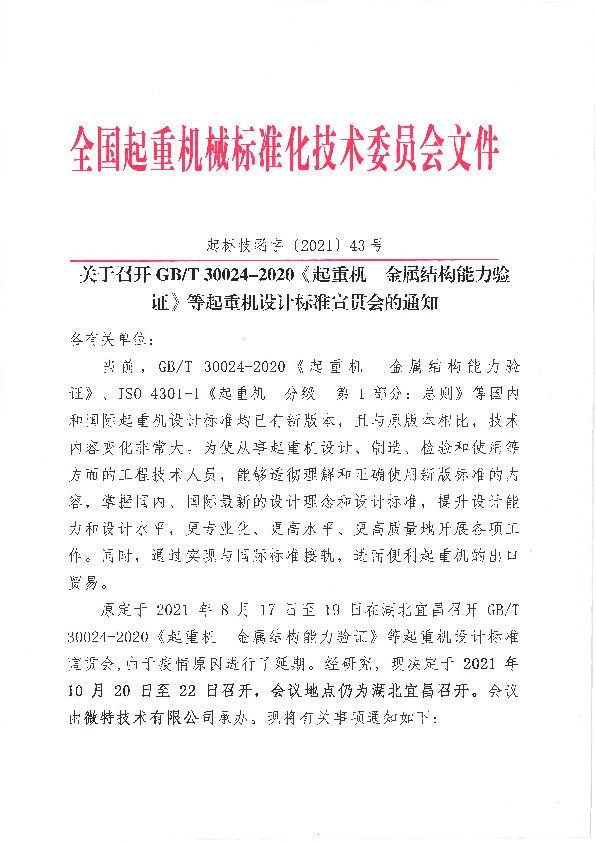 原定于2021年8月18日至19日在宜昌召開的全國起重機(jī)械標(biāo)準(zhǔn)化技術(shù)委員會組織的關(guān)于GB/T 30024-2020《起重機(jī) 金屬結(jié)構(gòu)能力驗(yàn)證》等起重機(jī)設(shè)計(jì)標(biāo)準(zhǔn)宣貫會,由于疫情原因進(jìn)行了延期。經(jīng)組委會研究決定將于2021年10月20日至22日仍在宜昌召開此次會議。