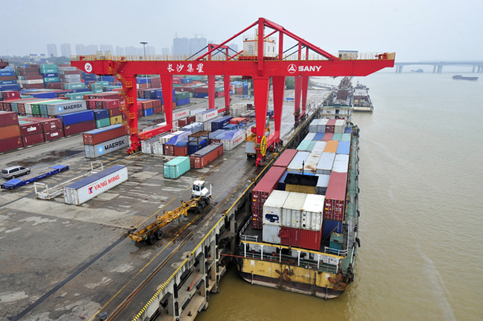 5日下午,一艘裝載著350標(biāo)箱的7000噸級集裝箱船緩緩靠泊長沙新港集裝箱碼頭。這是長沙新港通航史上的最大噸級船舶,也是長沙至上海內(nèi)支線上最大的船舶。