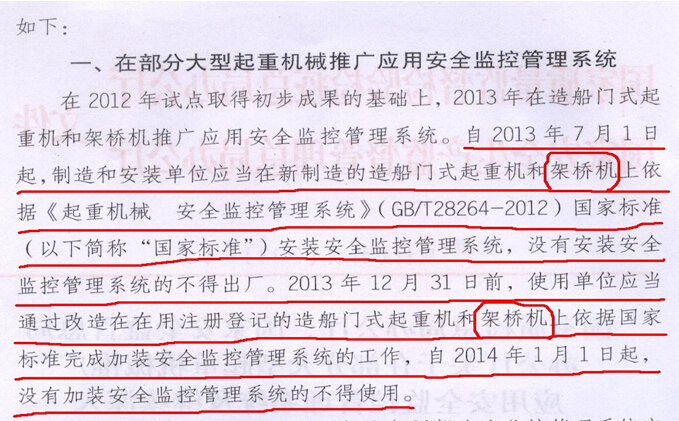 根據(jù)《國(guó)務(wù)院關(guān)于進(jìn)一步加強(qiáng)企業(yè)安全生產(chǎn)工作的通知》(國(guó)發(fā)[ 2010] 23號(hào))和《國(guó)務(wù)院辦公廳印發(fā)貫徹落實(shí)<國(guó)務(wù)院關(guān)于進(jìn)一步加強(qiáng)企業(yè)安全生產(chǎn)工作的通知> 重點(diǎn)工作分工方案的通知》(國(guó)辦函[2010] 140號(hào))的要求,國(guó)家質(zhì)檢總局與國(guó)家安全監(jiān)管總局聯(lián)合制定了《大型起重機(jī)械安裝安全監(jiān)控管理系統(tǒng)實(shí)施方案》,推動(dòng)大型起重機(jī)械安裝安全監(jiān)控管理系統(tǒng)工作,提高大型起重機(jī)械本質(zhì)安全,預(yù)防和減少起重機(jī)械重特大事故發(fā)生,制訂本工作方案。其指導(dǎo)思想是堅(jiān)持“以人為本,安全發(fā)展”的原則和“安全第一、預(yù)防為主、綜合治理”的方針,應(yīng)用現(xiàn)代物聯(lián)網(wǎng)信息管理技術(shù),以生產(chǎn)單位和使用單位為主體,提高大型起重機(jī)械本質(zhì)安全性能,促進(jìn)產(chǎn)品升級(jí)換代,防范事故發(fā)生,保障從業(yè)人員和公眾的生命安全。