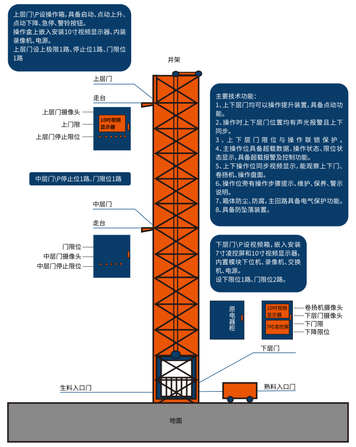 物料提升機(jī)是一種固定裝置的機(jī)械輸送設(shè)備,主要適用于粉狀、顆粒狀及小塊物料的連續(xù)垂直提升,設(shè)置了斷繩保護(hù)安全裝置、??堪踩b置、緩沖裝置、上下高度及極限限位器、防松繩裝置等安全保護(hù)裝置。