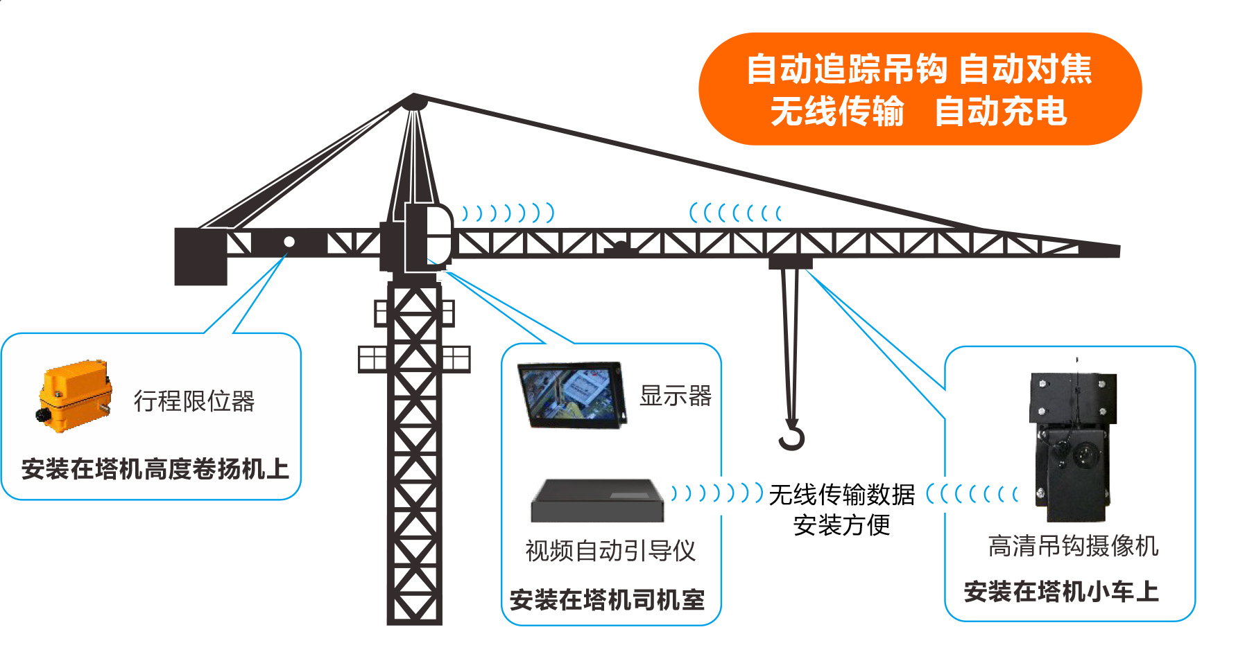 將攝像機安裝在塔式起重機大臂的最前端或者吊鉤上方,拍攝區(qū)域不會被其它物體遮擋,鏡頭可自動追蹤吊鉤,自動對焦,司機可清晰的看到拍攝畫面,根據(jù)拍攝畫面自主判斷吊裝情況,結(jié)合信號員的引導(dǎo)達到雙保險的效果。