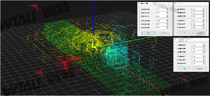傳感器采用混合固態(tài)多線激光云臺(tái)雷達(dá),通過(guò)激光發(fā)射組件快速旋轉(zhuǎn)的同時(shí)發(fā)射高頻率激光束對(duì)外界環(huán)境進(jìn)行持續(xù)性的掃描,獲取點(diǎn)陣列(光)散射到障礙物表面的點(diǎn)云圖案數(shù)據(jù),即障礙物在 360° 區(qū)域環(huán)境中的 3D 信息。在以配置的防碰撞系統(tǒng)軟件運(yùn)用PCL算法庫(kù)為基礎(chǔ),獲取到障礙物點(diǎn)云的聚類(即對(duì)物體的三維云識(shí)別)并提取出來(lái),然后計(jì)算障礙物點(diǎn)云到指定平面的最小距離,實(shí)現(xiàn)障礙物最近點(diǎn)的監(jiān)測(cè)。