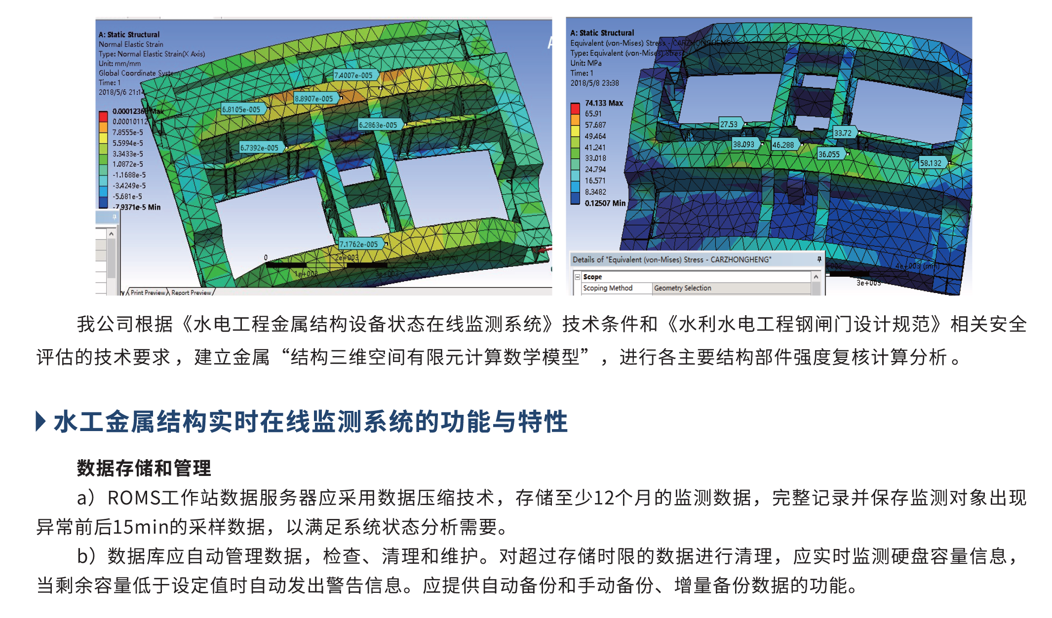 為保證運(yùn)行安全,以及安全使用壽命評(píng)估,閘門實(shí)時(shí)在線監(jiān)測數(shù)據(jù)主要參照《水利水電工程鋼閘門設(shè)計(jì)規(guī)范》 《水工鋼閘門和啟閉機(jī)安全檢測技術(shù)》《水利水電工程金屬結(jié)構(gòu)報(bào)廢標(biāo)準(zhǔn)》規(guī)定,預(yù)依據(jù)閘門設(shè)計(jì)制造要求對(duì)不同閘 門進(jìn)行有限元計(jì)算形成主要監(jiān)測部位構(gòu)件驗(yàn)算結(jié)果作為檢驗(yàn)標(biāo)準(zhǔn)。