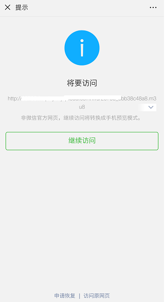 騰訊云放回的m3u8地址是一個(gè)直播的視頻流地址,直接播放會(huì)在微信頁(yè)面有一個(gè)【繼續(xù)訪問】的頁(yè)面提示;