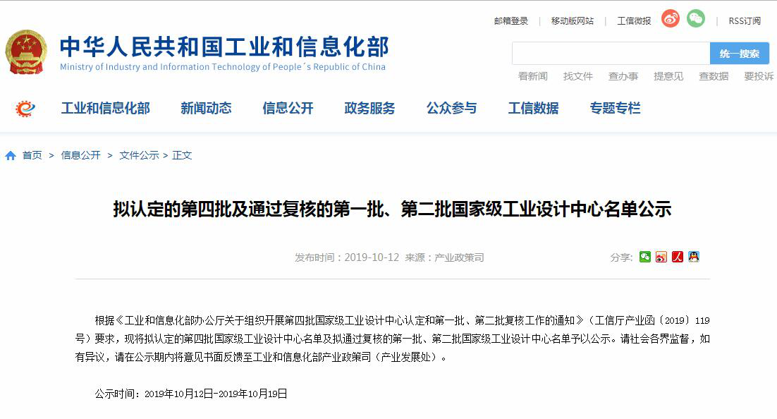 2019年,10月12日,中華人民共和國工業(yè)和信息化部網站發(fā)布《擬認定的第四批及通過復核的第一批、第二批國家級工業(yè)設計中心名單公示》信息,微特技術有限公司被認定為第四批國家級工業(yè)設計企業(yè)。