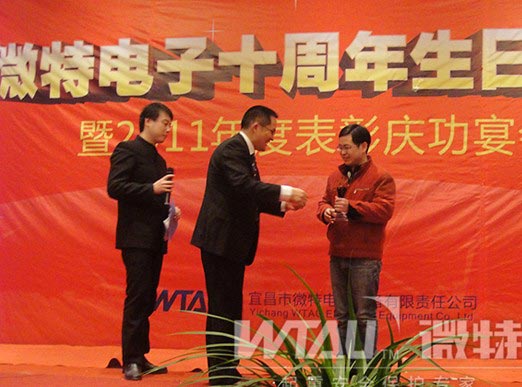2011年度先進(jìn)表彰,明星閃耀?,F(xiàn)生產(chǎn)部主管:羅毅,榮獲年度最燦爛的大獎(jiǎng)“微特之星”稱號(hào)?。▓D為頒獎(jiǎng)現(xiàn)場)